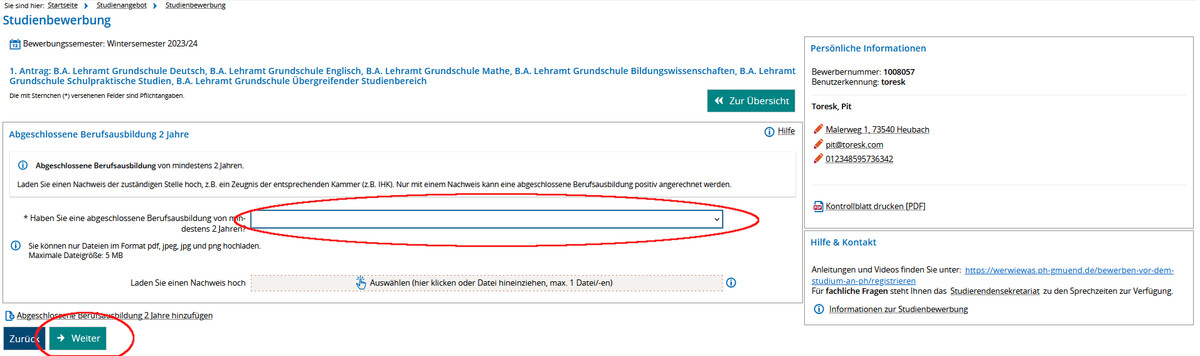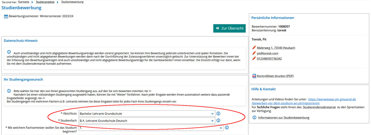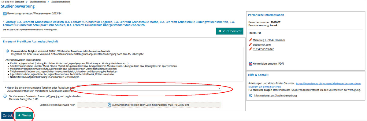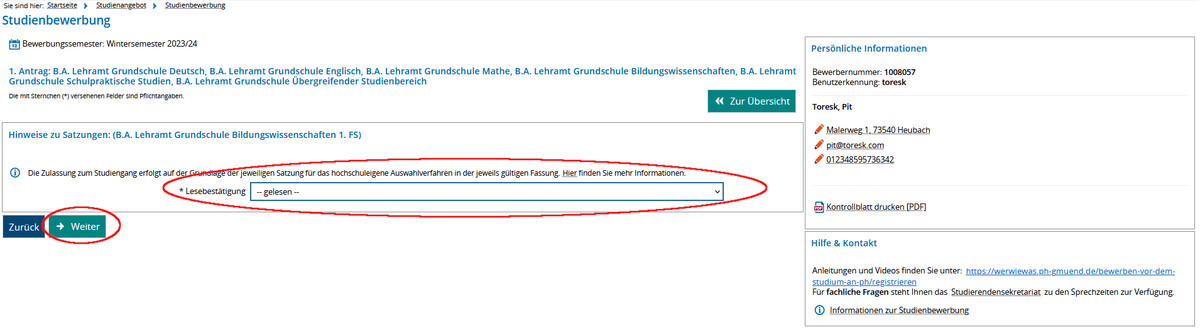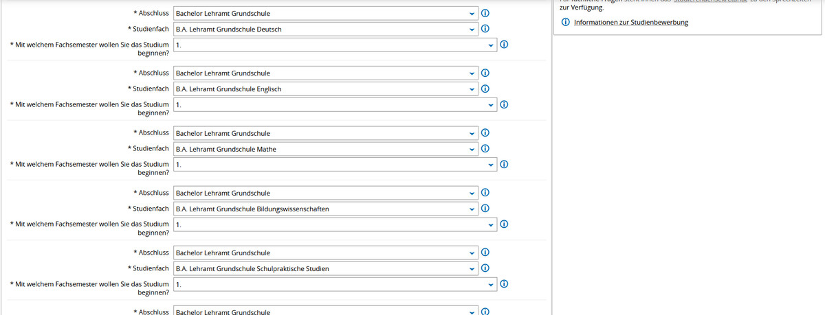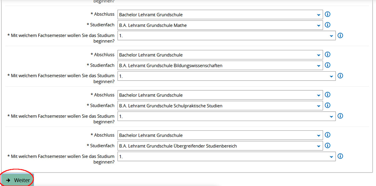 In unserem Beispiel wird ein Bewerbungsantrag für das Studium Lehramt-Grundschule angelegt. Sie müssen sich nun durch die einzelnen Schritte durchklicken. Beachten Sie hierzu die Hinweise.