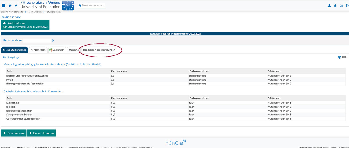 Über Mein Studium wählen Sie Studienservice aus und Sie gelangen zu der bekannten Übersicht. Hier klicken Sie auf den Reiter ganz rechts - Bescheide/Bescheinigungen.