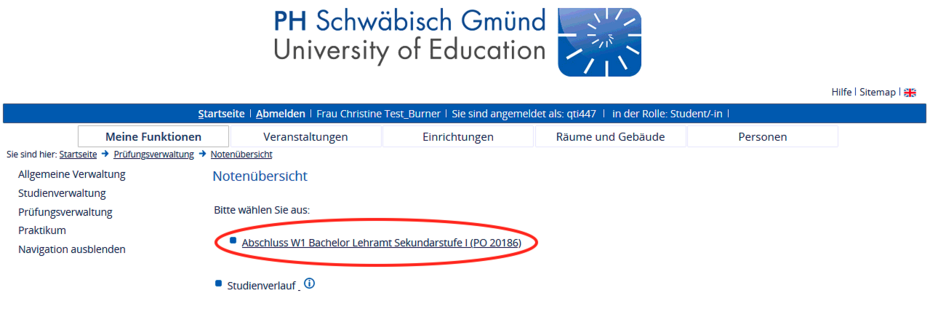 Anschließend klicken Sie in der linken Spalte auf "Prüfungsverwaltung".