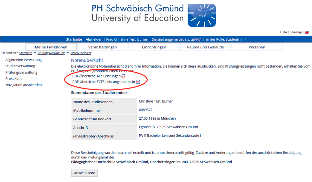 Abschließend wählen Sie Ihre gewünschte Übersicht. Sie haben die Wahl zwischen "Alle Leitungen" und der "ECTS-Leistungsübersicht". Klicken Sie heirfür auf das nebenstehende PDF-Symbol.